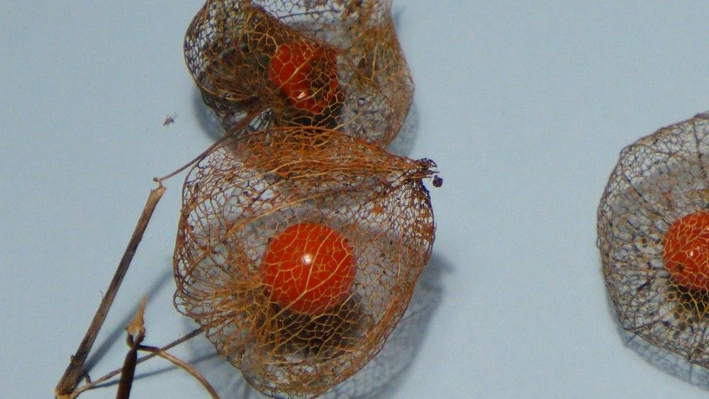 Mais je les aime aussi l'hiver, lorsque ayant perdu leur coque orange, elles dévoilent l'armature délicate qui contient leur fruit, justifiant alors leur nom d'amour en cage...