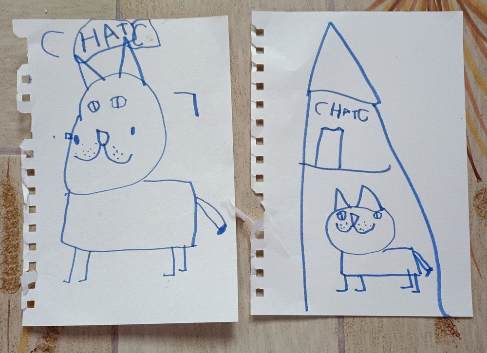 Elle a écrit CHATC, leur a fait 2 oreilles pointues, 4 pattes, un petit nez, des yeux