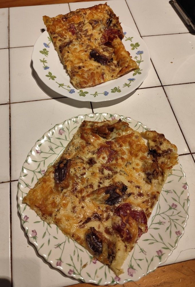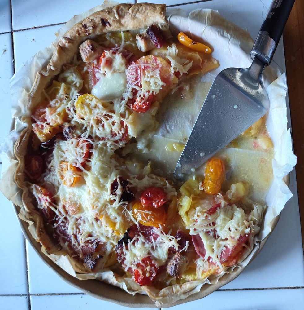 Ma soeur Pascale est venue passer quelques jours chez moi, et a préparé un soir une pizza-crêpe au four. C'était très bon. Ingrédients pour 4 personnes : 3 oeufs 35 cl de lait 175 g de farine 80 g de magret séché 50 g de saucisson sec 100 g de gruyère...
