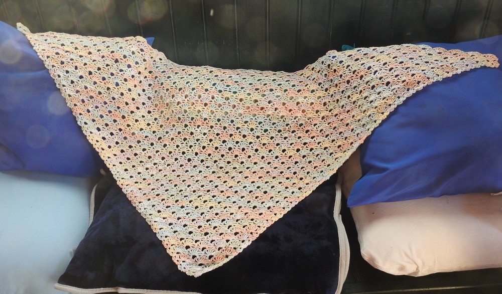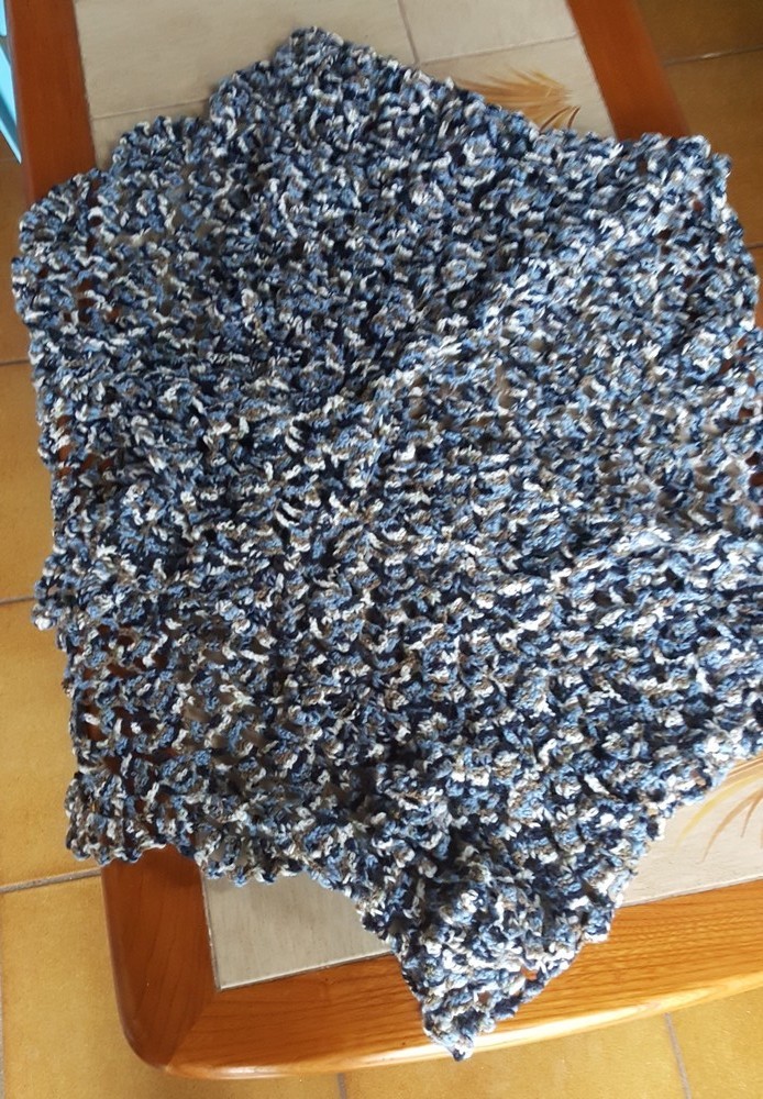 J'ai trouvé ce modèle sur le site des laines Katia. C'est une sorte de châle-poncho avec manches, et ce sera chaud pour l'hiver, pour lire ou regarder la télé. J'ai utilisé un crochet n°4,5 et 220 g de fil (Pingo fluffy de Pingouin, couleur sable).