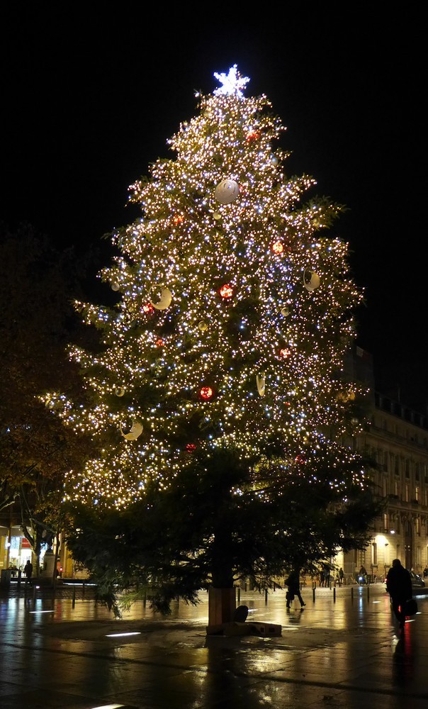 Depuis quelques jours, le château d'eau de ma commune est illuminé la nuit. Des projecteurs diffusent des tableaux colorés sur le bâtiment. Quatre séquences se succèdent : des sapins enneigés, une nuit étoilée de Van Gogh, et deux autres avec des motifs...